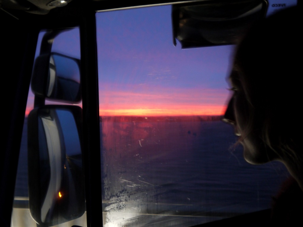 Um kurz nach sieben, die Formalitäten sind erledigt, der nostalgisch dampfstiemende Wunderbaum-Tabakrauch-Express wieder zischend in Fahrt, werden wir für den langen Tag und die kurze Nacht mit einem grandiosen Sonnenaufgang über dem Storstrøm belohnt.