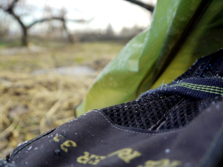 Ja, das da auf dem Rucksack ist Raureif, das ist die eingefrorene Gewissheit, dass wir letzte Nacht keine Weicheier waren, als uns trotz 3 Lagen Fleece, Decke, Schlafsack und Zelt in den Pfirsichplantagen neben der A4 kalt wurde.
