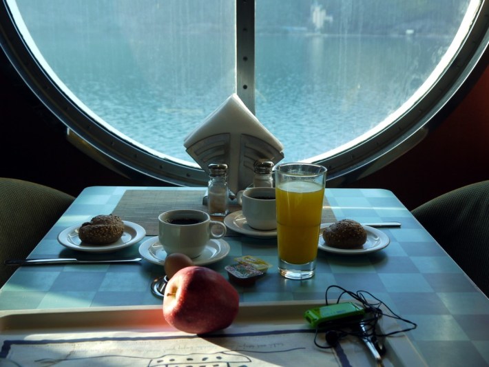 Es ist beruhigend zu sehen, dass die Horizontlinie des Meeres parallel zur Oberfläche des o-Saftes ist. Das ist bei italienischen Schiffen nicht immer so.