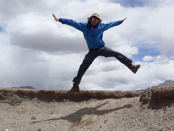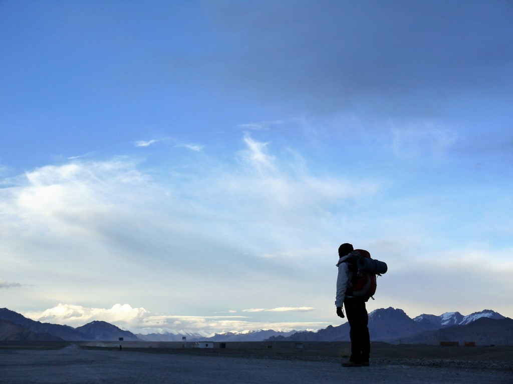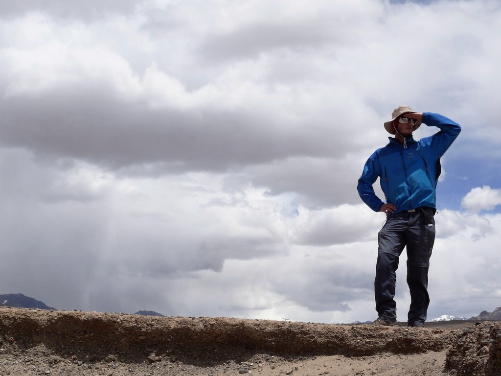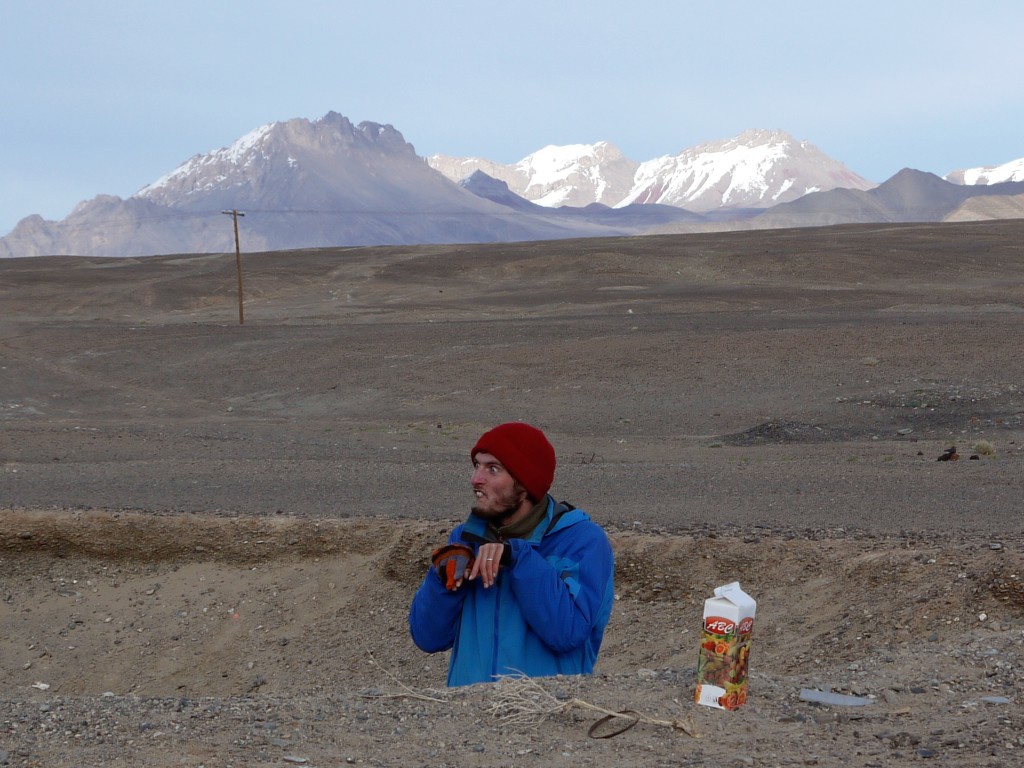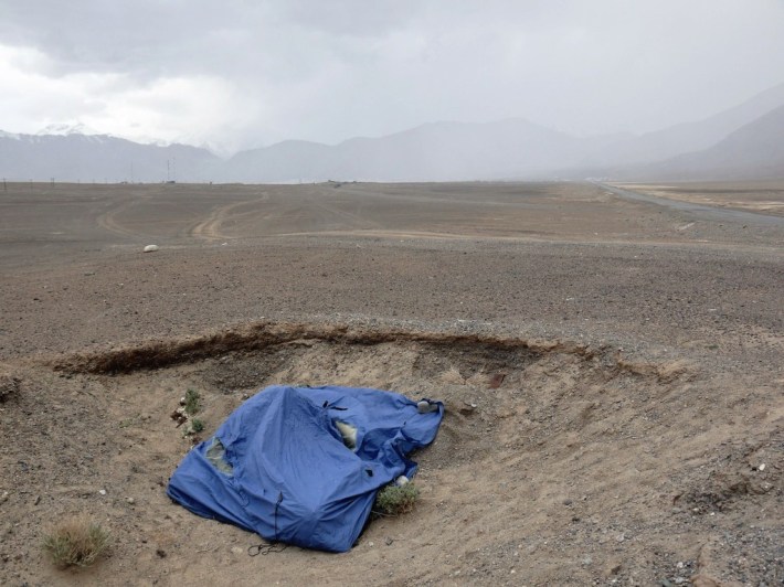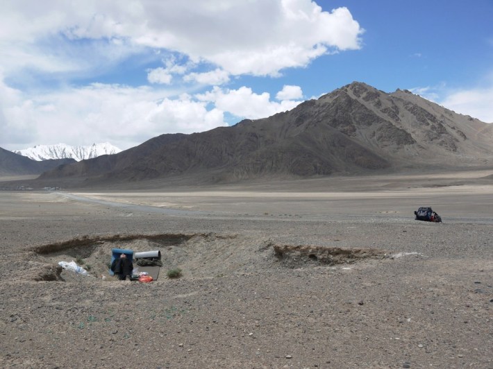 Die Kreuzung. Eine grob asphaltierte Straße und eine Piste, die sich so wenig vom Wüstenboden abhebt, dass wir sie fast übersehen hätten. Hier schlagen wir unser Lager auf, denn wenn die geballte tadschikische Tramper-Erfahung eines besagt, dann die folgende Weisheit: Das kann lange dauern. Der Wind pfeift scharf, hier oben, auf 3612 Metern über dem fernen Meer. Da kommt das mysteriöse Erdloch sehr gelegen, das eines Meteoritenkraters gleich, als außerirdisch-absurde Konkarve mitten in die endlose Ebene ragt. Wir nehmen Haltung an: