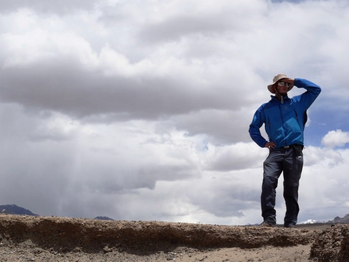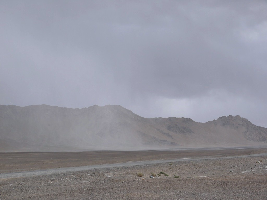 Dunkle Wolken ziehen über die hohen Berge. Das trübe Zeug, das über die weite Ebene auf uns zusteuert, verspricht nichts gutes.