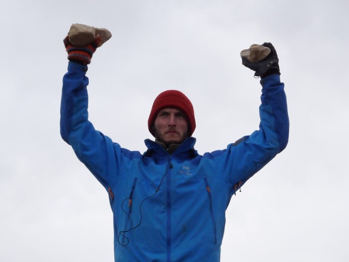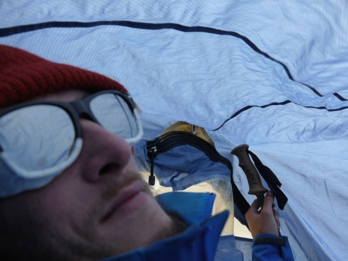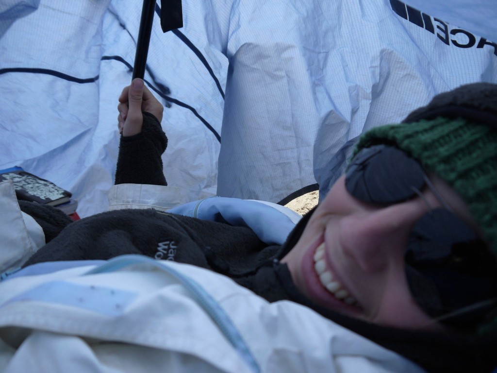 Es stürmt immer noch. Aber kein Grund, den Mut zu verlieren: Wir sind gewappnet, mit Erdloch und Zeltplane.