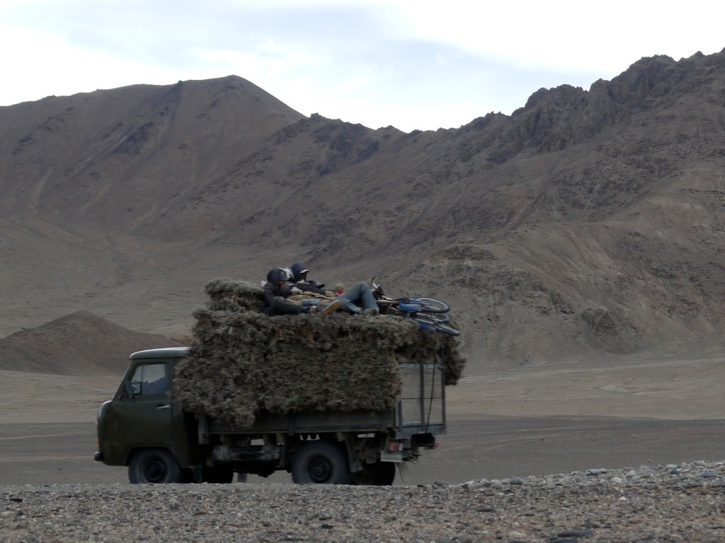 Da! Ein Sammeltaxi!! Die Typen halten an, sie haben noch Platz in ihrer Tabletka, einem Minibus aus den 1970er Jahren, geformt wie ein Lutschbonbon. Nachdem sie uns ansehen wie Marsbewohner, finden wir langsam heraus, dass sie nur ein paar Kilometer fahren, zum Brennstoff sammeln. Brennstoff ist in diesen Klimaten nicht etwa Holz, sondern vertrocknetes knorriges kleines Buschwerk, das wie in Western-Filmen über den Wüstenboden kullert, wenn es windig wird.