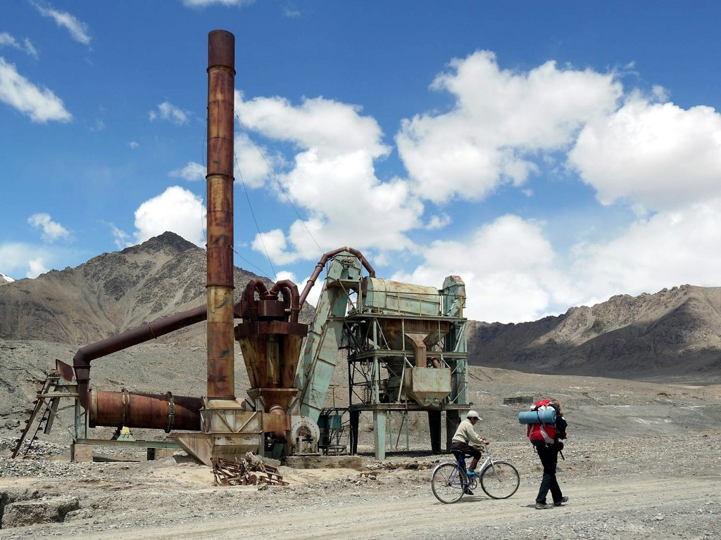 Sachen gepackt, Mut gefasst und raus aus der Stadt. Die berühmte einzige Karte vom Pamir, angefertigt vom Schweizer Kartographen Markus Hauser, suggeriert, dass etwas östlich von Murgab zwei Straßen zusammentreffen, die nach Norden führen. Um keine Gelegenheit zu verpassen, wandern wir an diese Kreuzung, vorbei an den zauberhaften Zeugen blühender Sowjetvergangenheit. Ein Junge begleitet uns ein Stück des Weges. Wir sind auf gleicher Höhe: Wir kennen kein Kirgisisch, die Sprache seiner ethnischen Minderheit und unseres Ziel-Landes, er kein Avtostop.