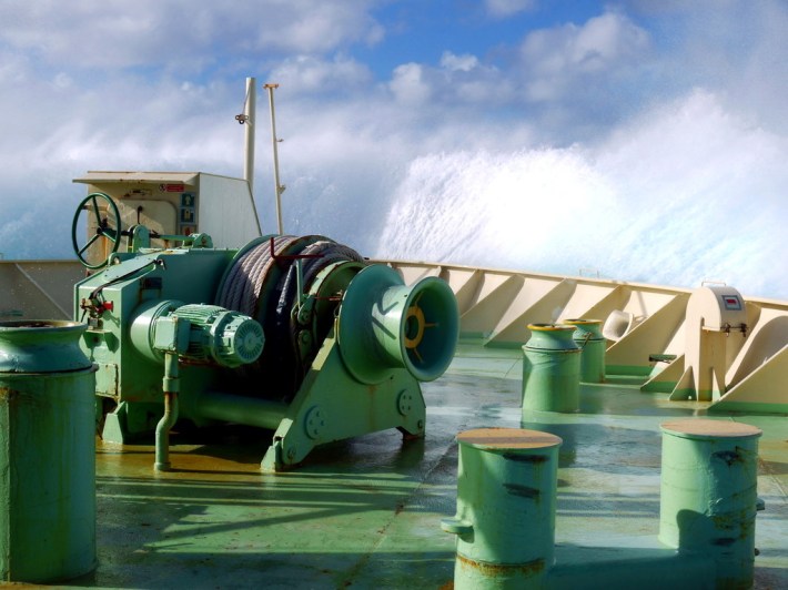 So pastell, und doch so kräftig: Türkiser, beiger und gelber Lack in Harmonie mit hellblauem Himmel. Das ewige blau sprüht hier in seiner weißesten Form: Gischt über dem Bug der Hansa Stockholm