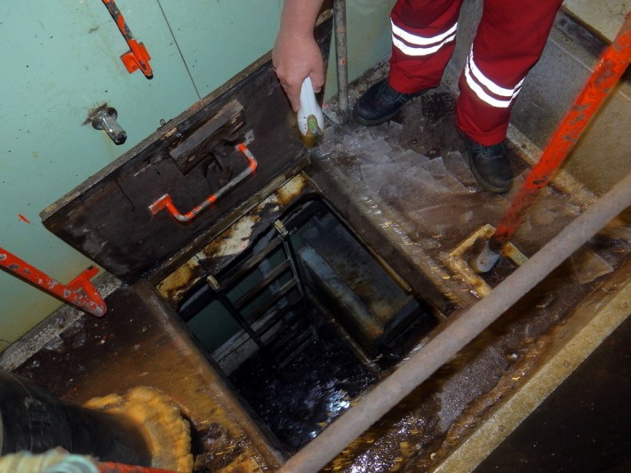 Durch diese Luke musst du gehen, willst du 5000 Tonnen Südfrüchte sehen. Feinsäuberlich gestapelt in Pappkartons und auf 0,8 Grad Celsius gekühlt warten sie geduldig auf ihr Schicksal in europäischen Lagerhallen, LKWs, Supermarktregalen und Esstischen.